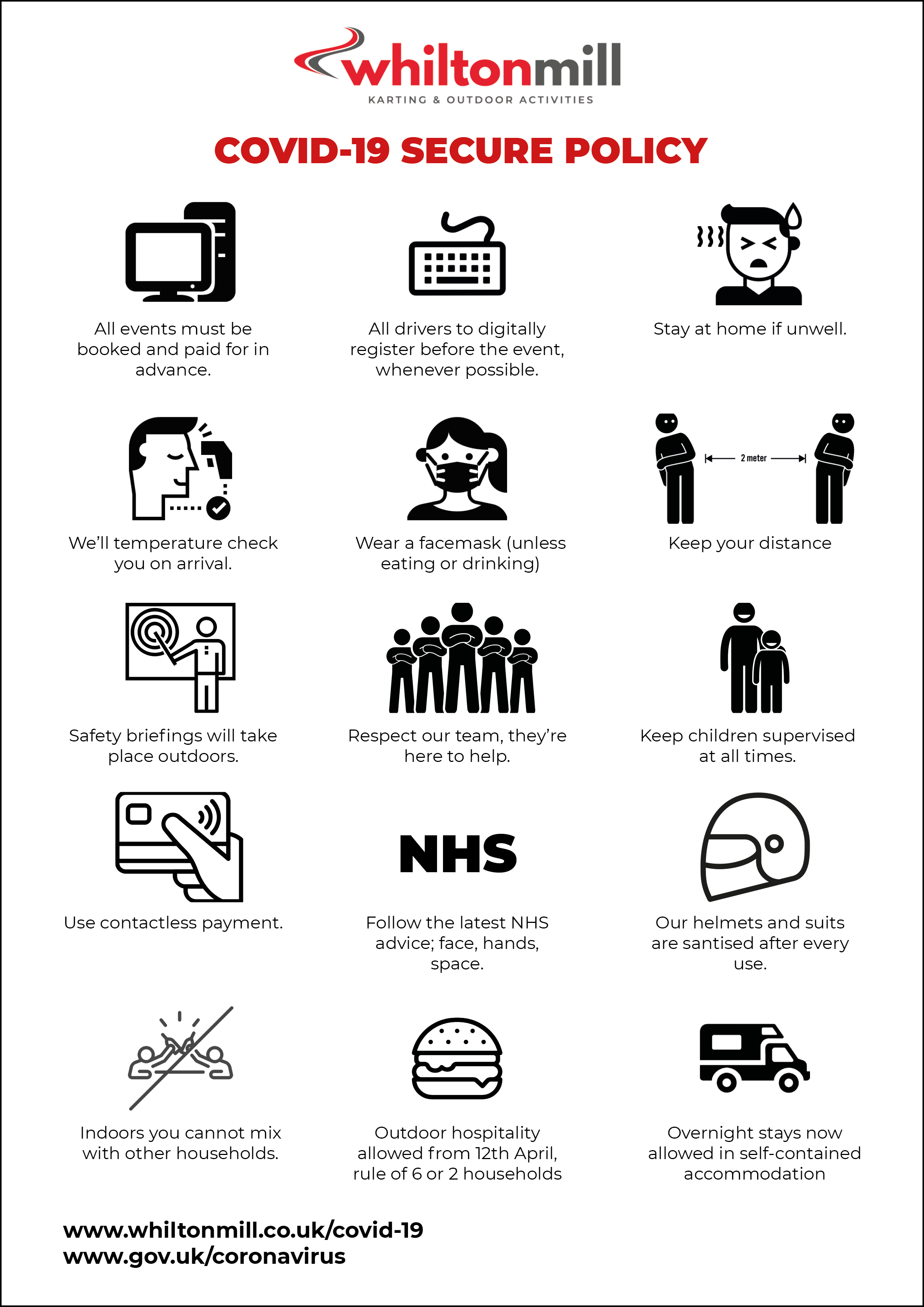 As of 12th April, we are open for the following activities.